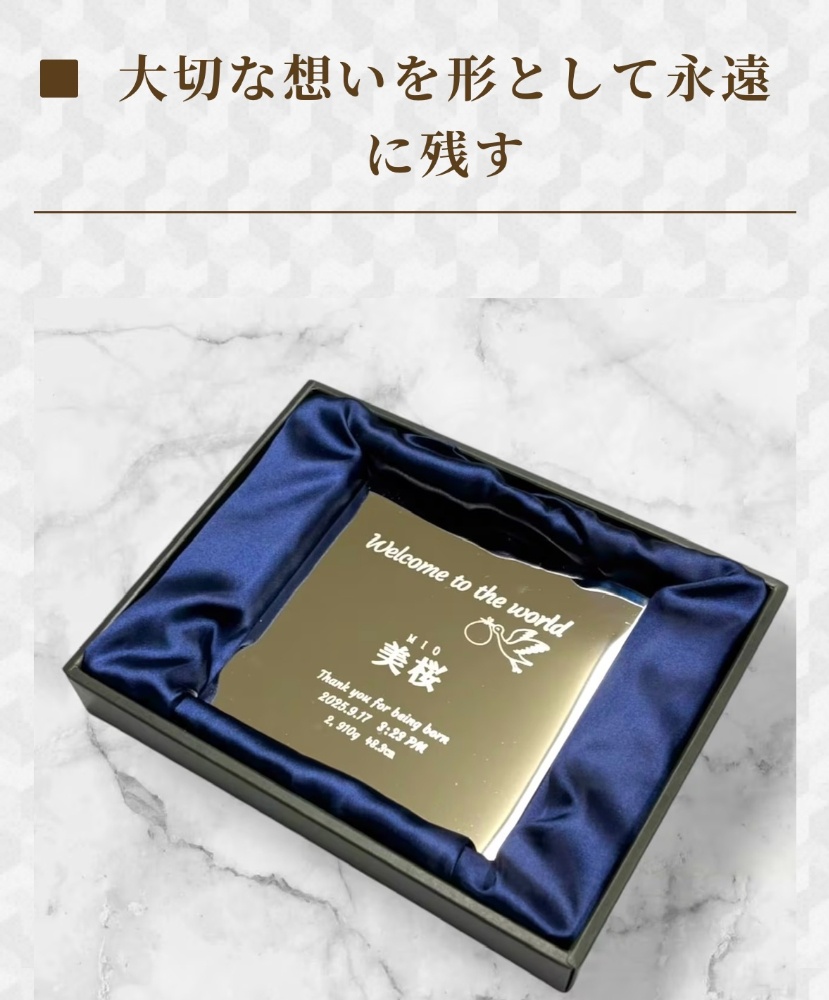 可愛らしいイラストと生まれてきてくれてありがとうのメーッセジとともに「お名前・出生日・体重・身長」をステンレスに刻み永遠に残す盾